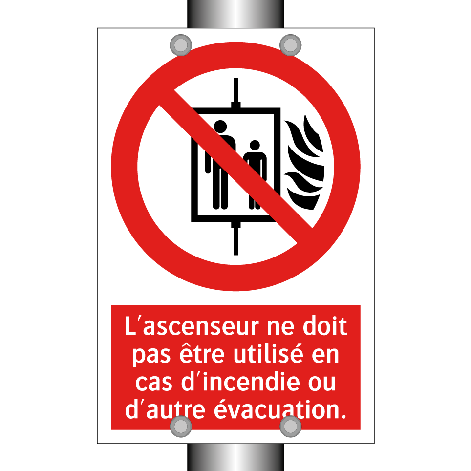 Panneau d'interdiction avec le texte : "L'ascenseur ne doit pas être utilisé en cas d'incendie ou d'autre évacuation." et une symbolique claire.