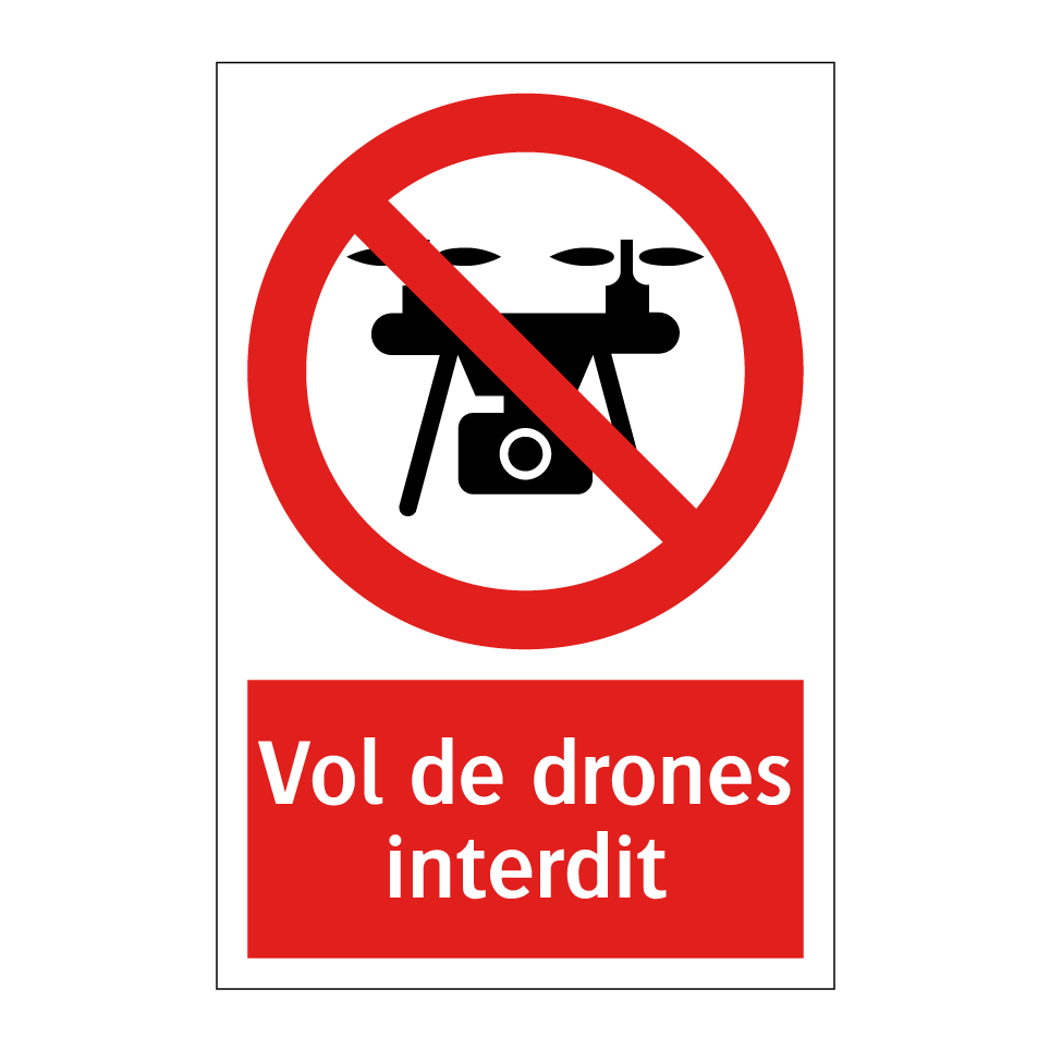 Panneau d'interdiction avec le texte : "Vol de drones interdit" et une symbolique claire.