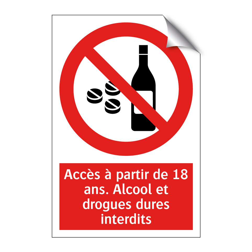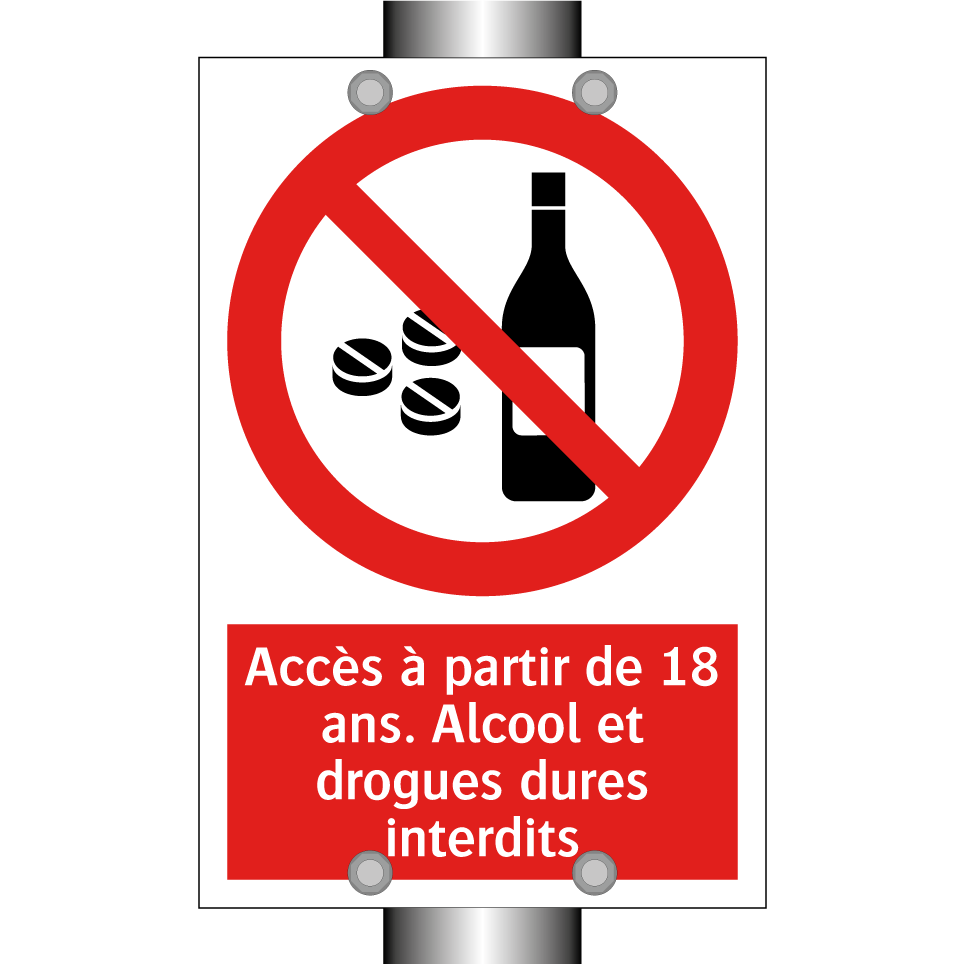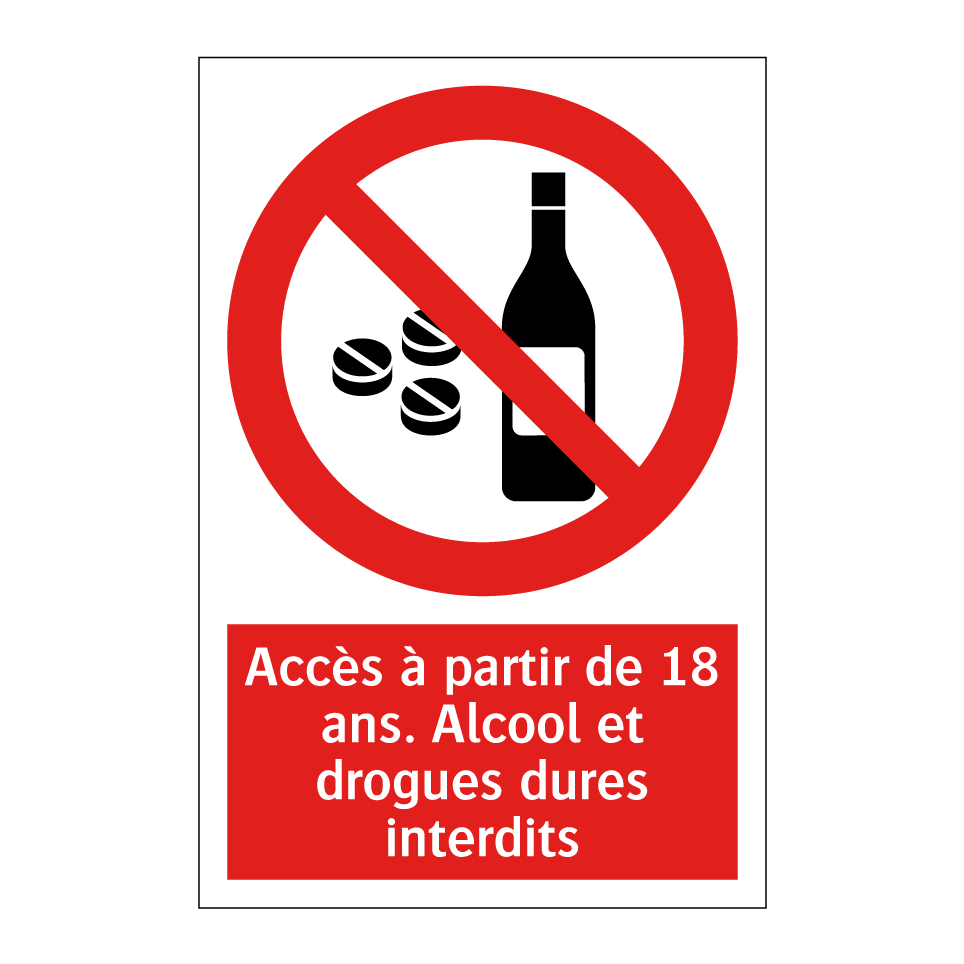 Panneau d'interdiction avec le texte : "Accès à partir de 18 ans. Alcool et drogues dures interdits" et une symbolique claire.