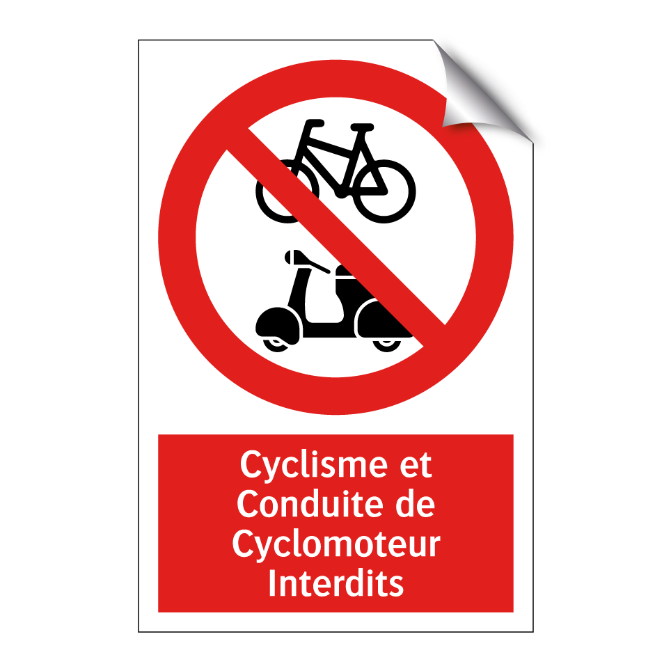 Panneau d'interdiction avec le texte : "Cyclisme et Conduite de Cyclomoteur Interdits" et une symbolique claire.