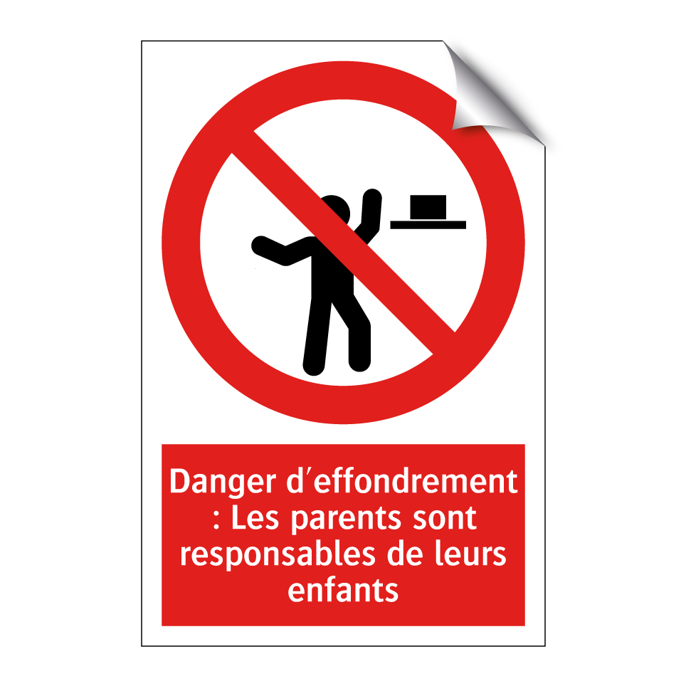 Panneau d'interdiction avec le texte : "Danger d'effondrement : Les parents sont responsables de leurs enfants" et une symbolique claire.