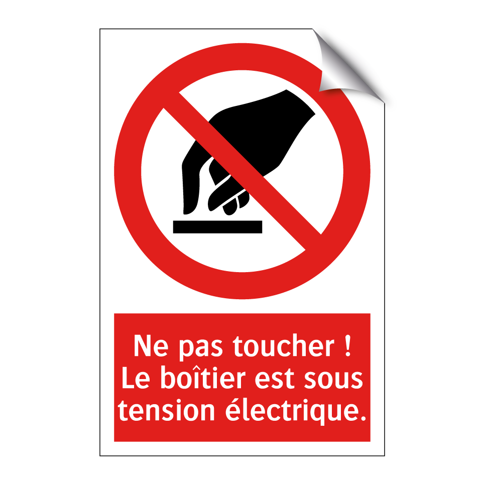 Panneau d'interdiction avec le texte : "Ne pas toucher ! Le boîtier est sous tension électrique." et une symbolique claire.
