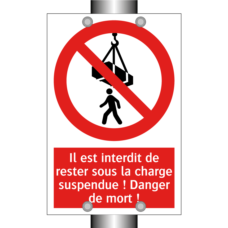 Panneau d'interdiction avec le texte : "Il est interdit de rester sous la charge suspendue ! Danger de mort !" et une symbolique claire.