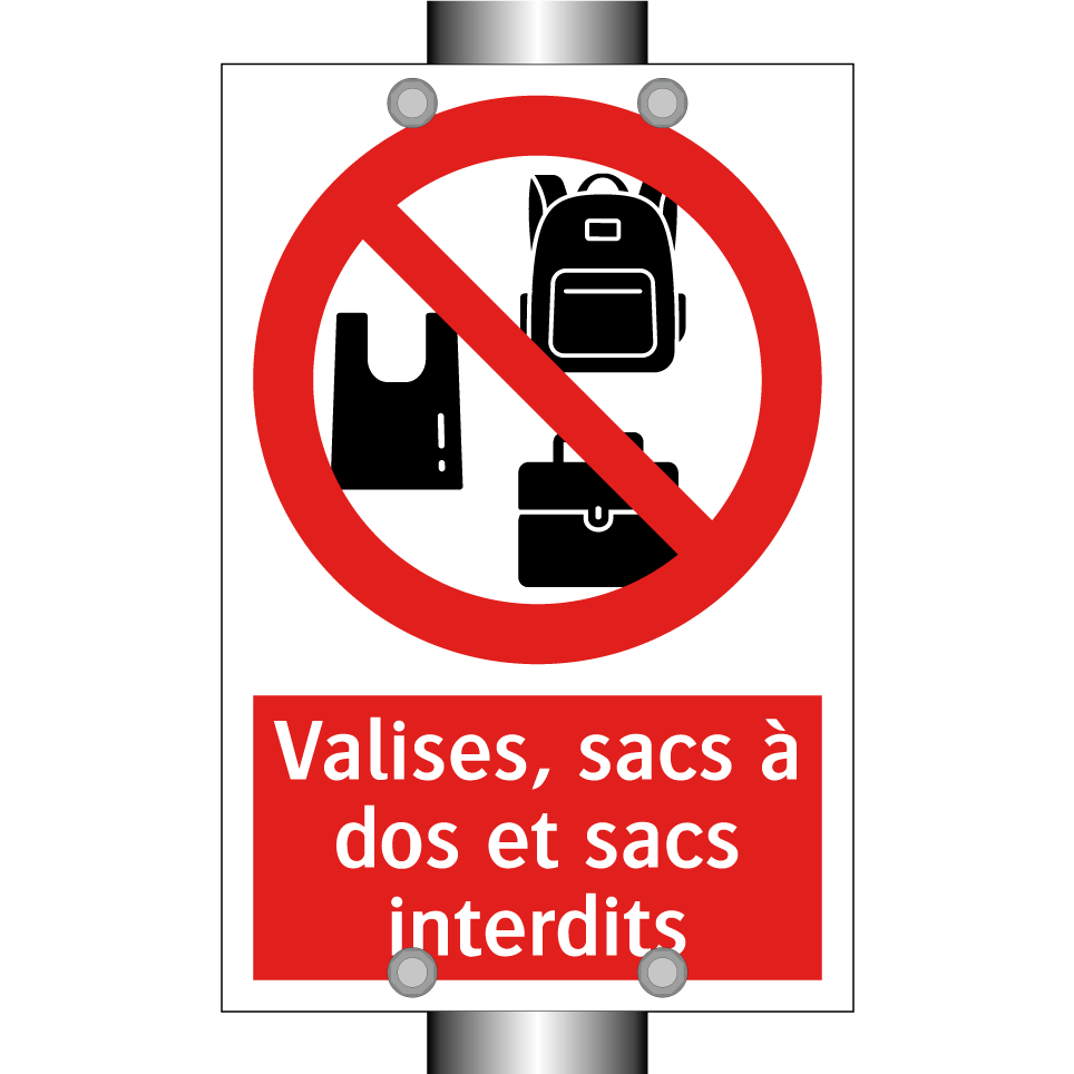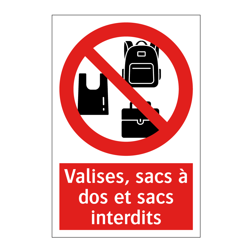 Panneau d'interdiction avec le texte : "Valises, sacs à dos et sacs interdits" et une symbolique claire.