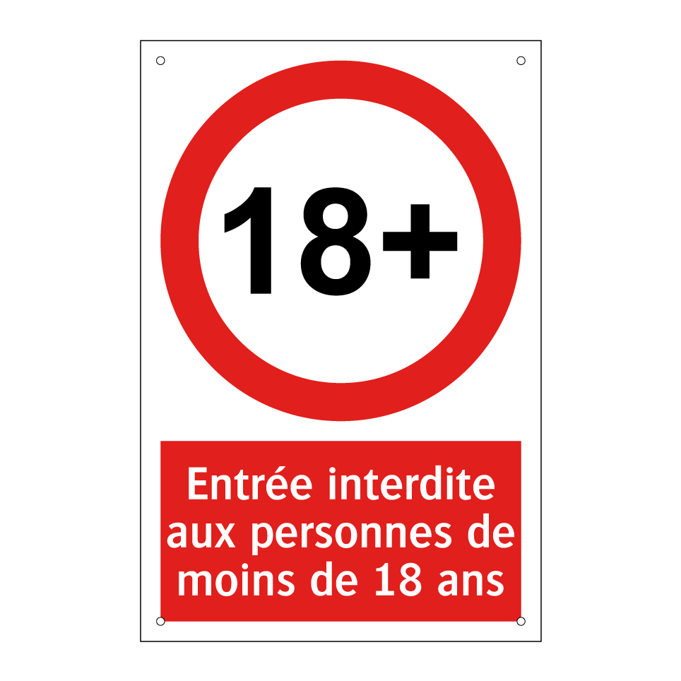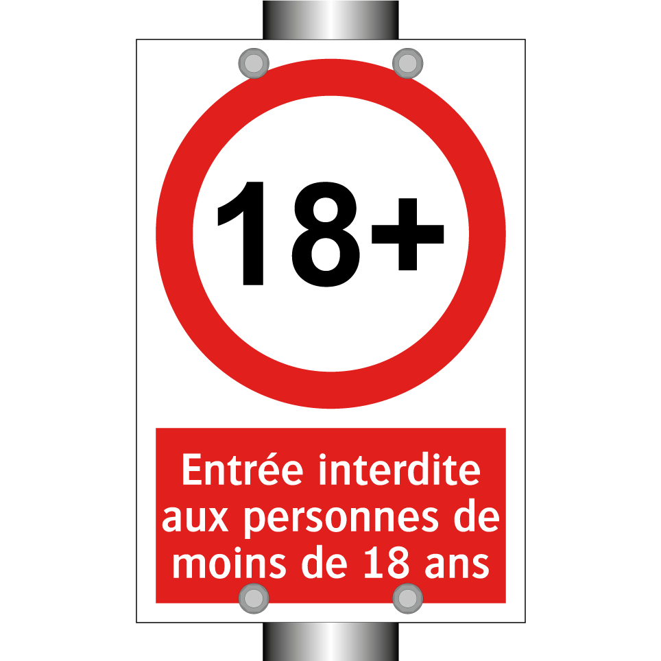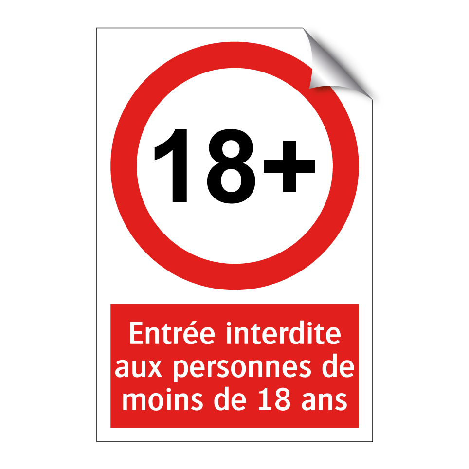 Panneau d'interdiction avec le texte : "Entrée interdite aux personnes de moins de 18 ans" et une symbolique claire.
