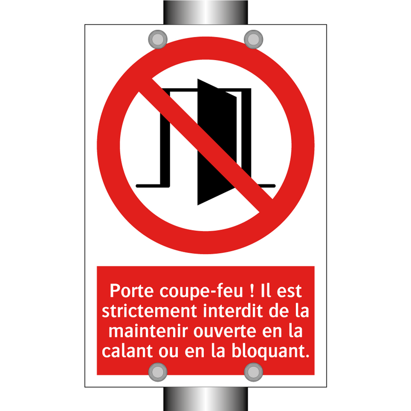 Panneau d'interdiction avec le texte : "Porte coupe-feu ! Il est strictement interdit de la maintenir ouverte en la calant ou en la bloquant." et une symbolique claire.