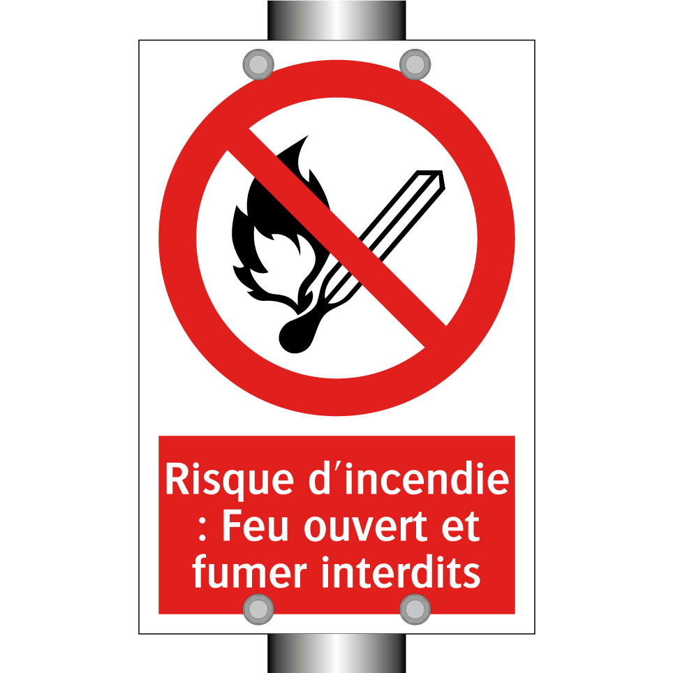 Panneau d'interdiction avec le texte : "Risque d'incendie : Feu ouvert et fumer interdits" et une symbolique claire.