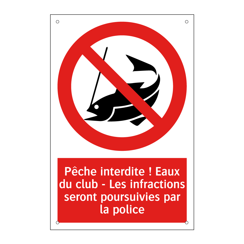 Panneau d'interdiction avec le texte : "Pêche interdite ! Eaux du club - Les infractions seront poursuivies par la police" et une symbolique claire.