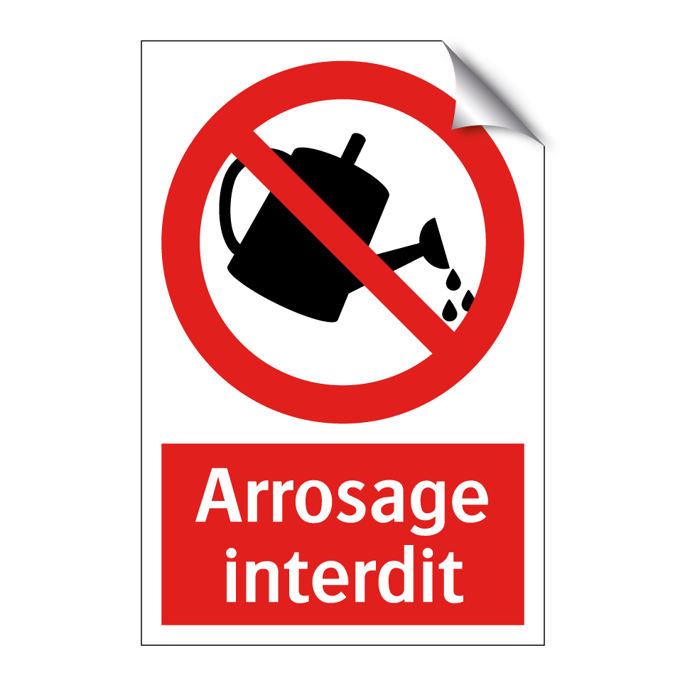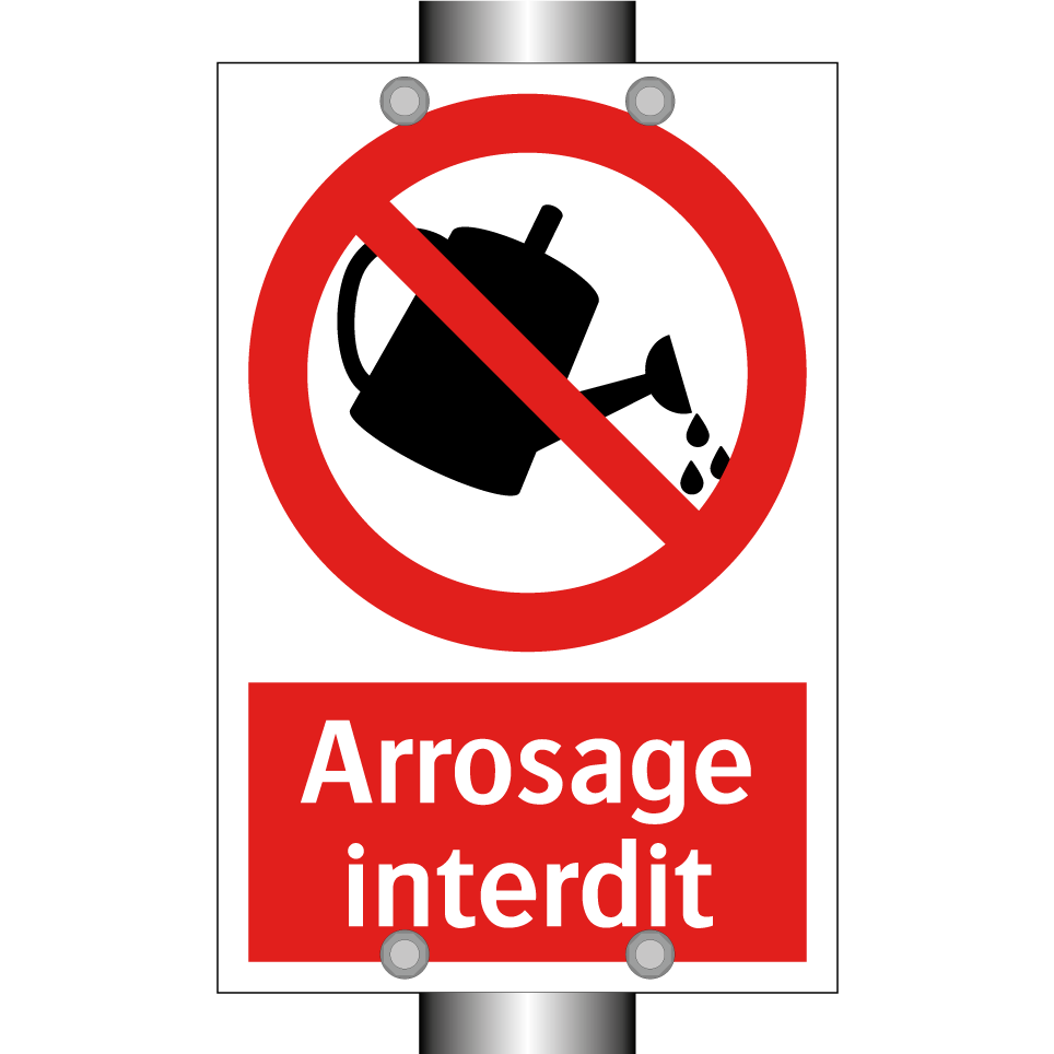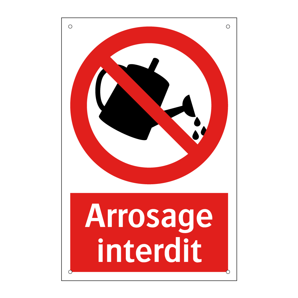 Panneau d'interdiction avec le texte : "Arrosage interdit" et une symbolique claire.