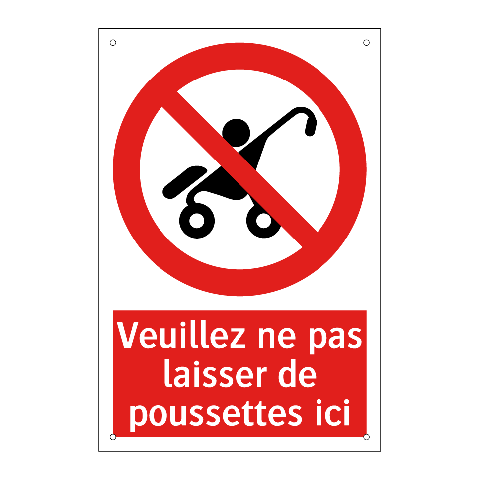 Panneau d'interdiction avec le texte : "Veuillez ne pas laisser de poussettes ici" et une symbolique claire.
