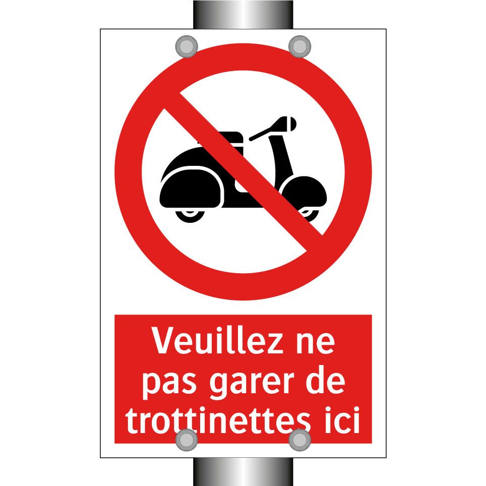 Panneau d'interdiction avec le texte : "Veuillez ne pas garer de trottinettes ici" et une symbolique claire.