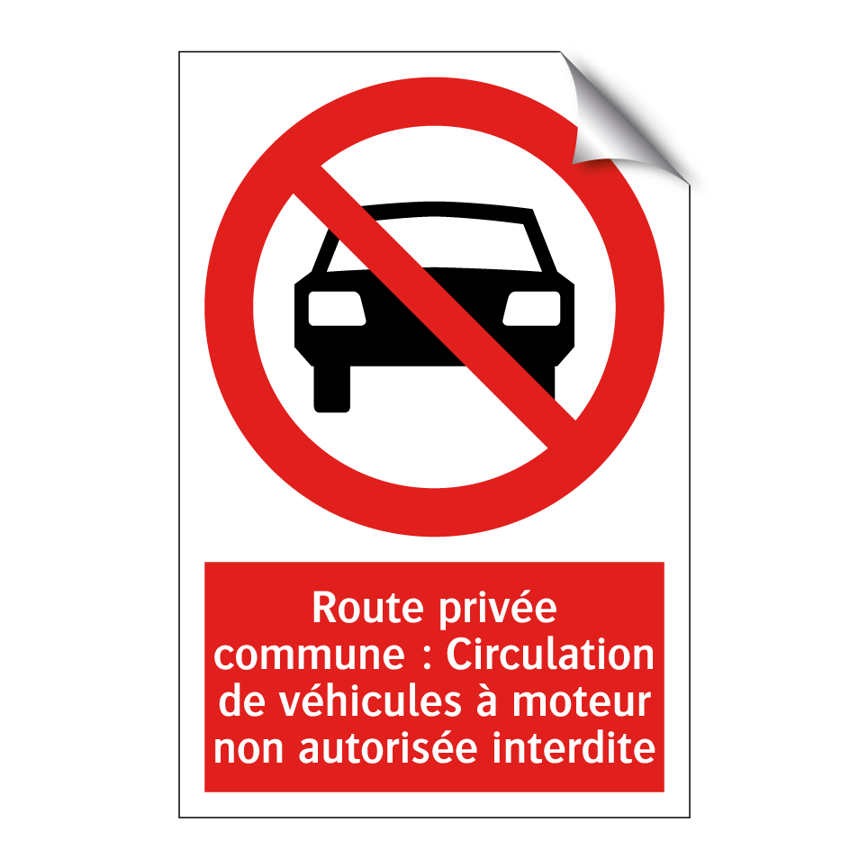 Panneau d'interdiction avec le texte : "Route privée commune : Circulation de véhicules à moteur non autorisée interdite" et une symbolique claire.