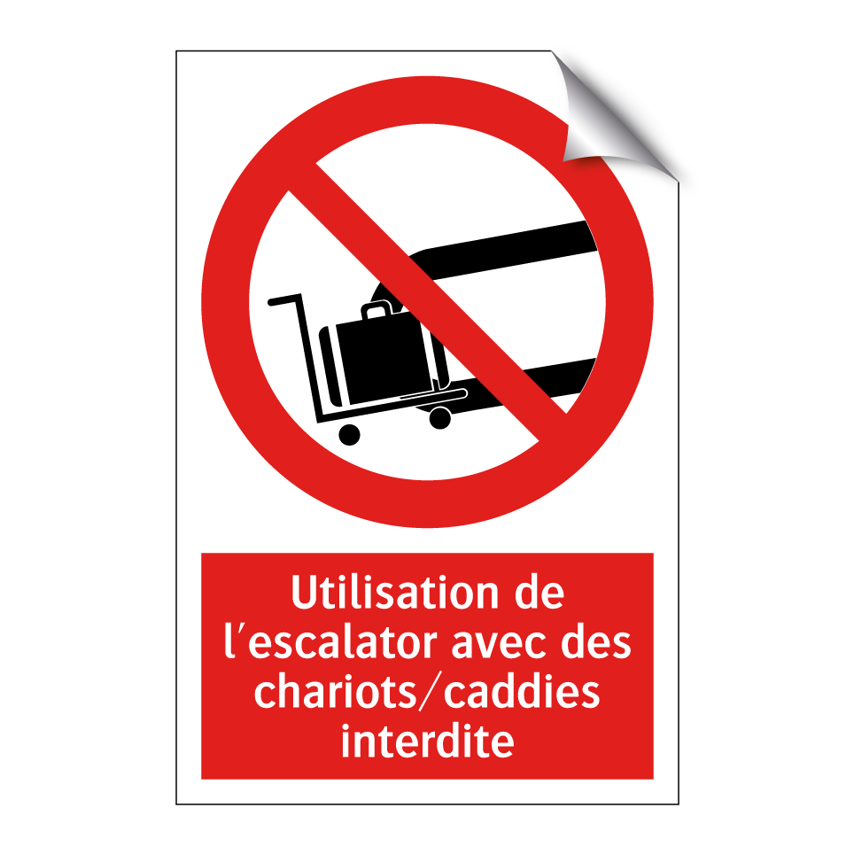 Panneau d'interdiction avec le texte : "Utilisation de l'escalator avec des chariots/caddies interdite" et une symbolique claire.