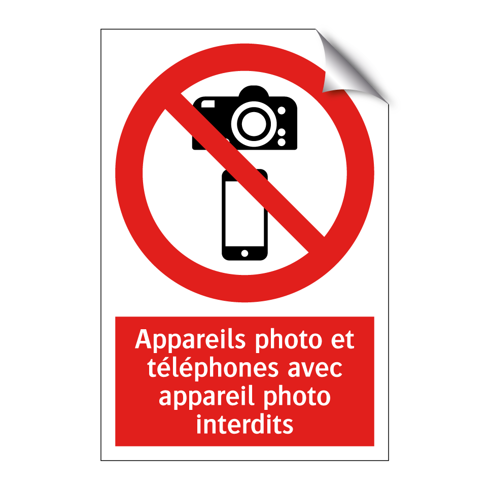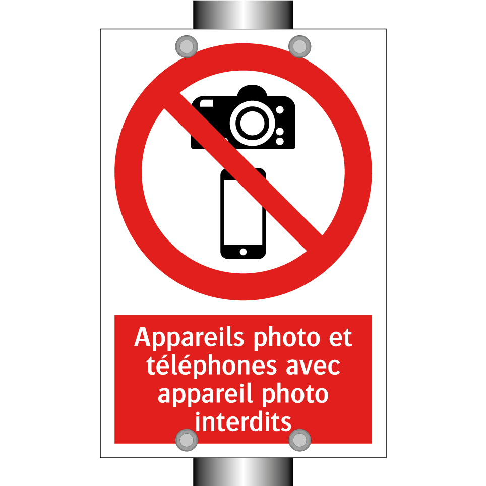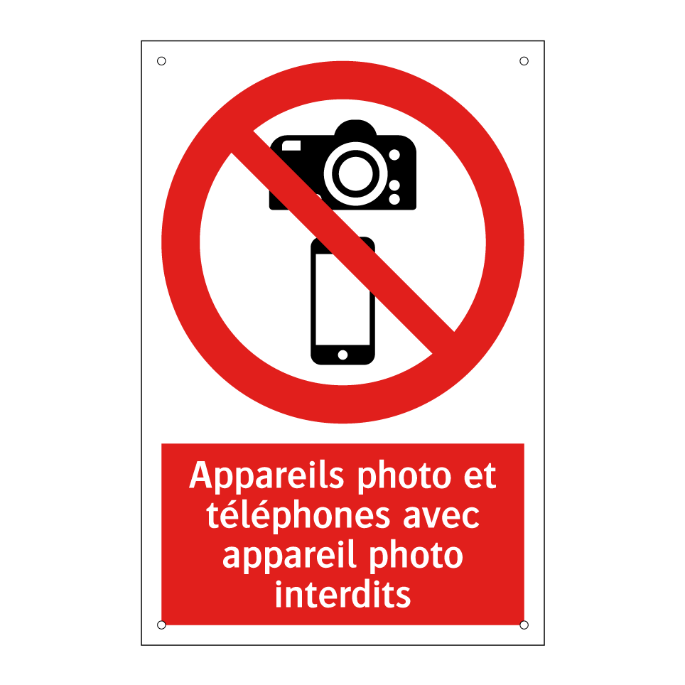 Panneau d'interdiction avec le texte : "Appareils photo et téléphones avec appareil photo interdits" et une symbolique claire.