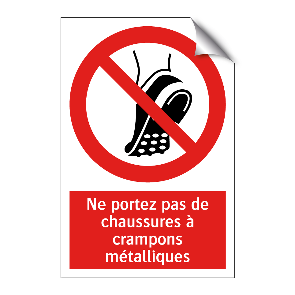 Panneau d'interdiction avec le texte : "Ne portez pas de chaussures à crampons métalliques" et une symbolique claire.