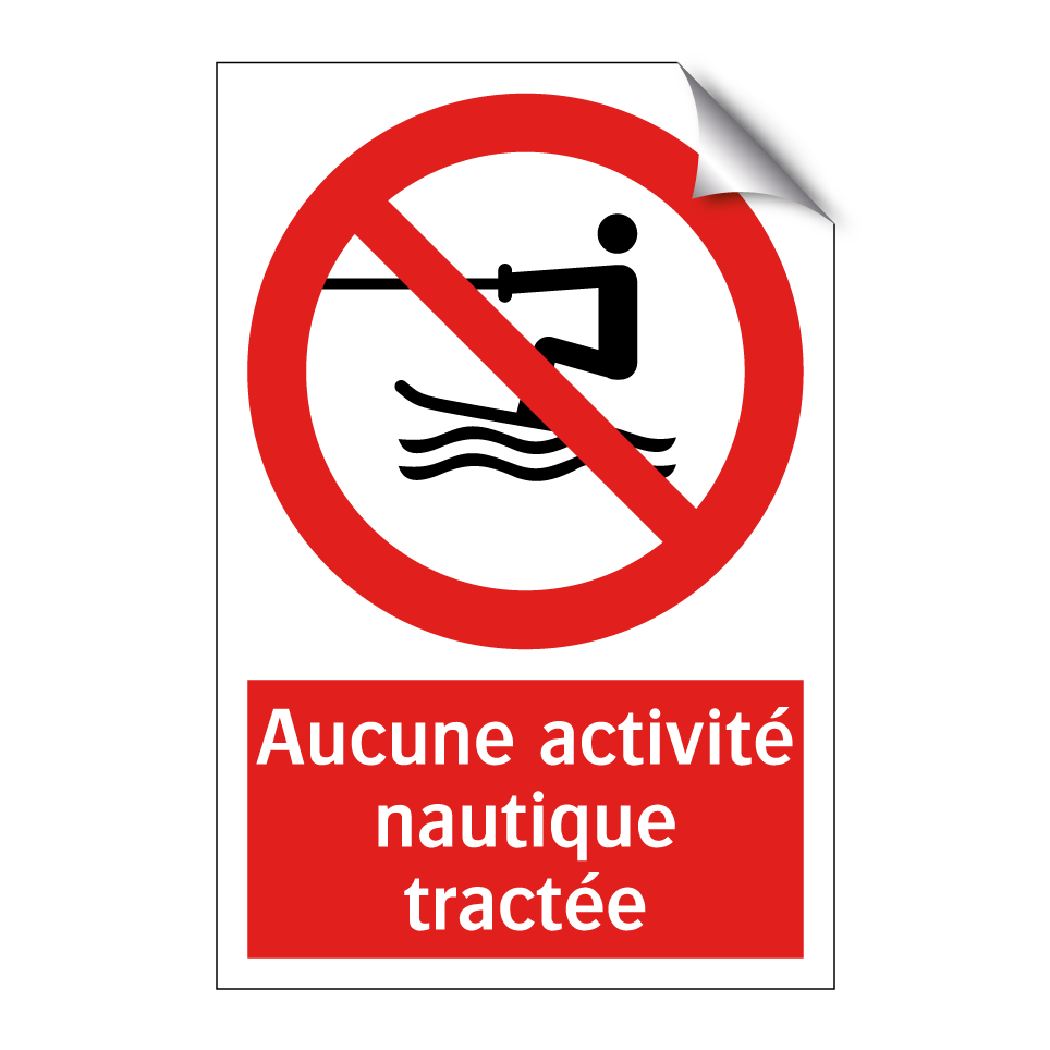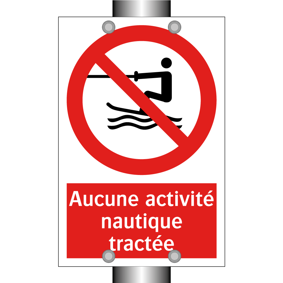 Panneau d'interdiction avec le texte : "Aucune activité nautique tractée" et une symbolique claire.