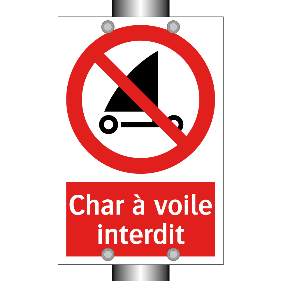 Panneau d'interdiction avec le texte : "Char à voile interdit" et une symbolique claire.
