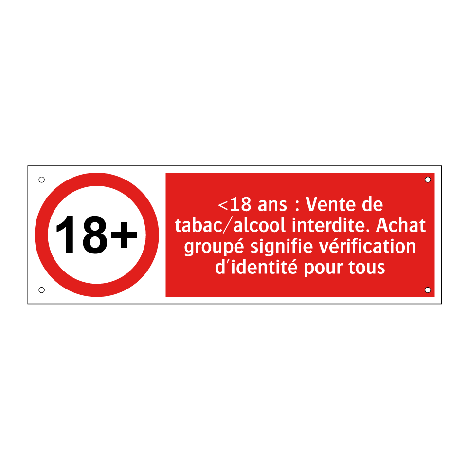 Panneau d'interdiction avec le texte : "<18 ans : Vente de tabac/alcool interdite. Achat groupé signifie vérification d'identité pour tous" et une symbolique claire.
