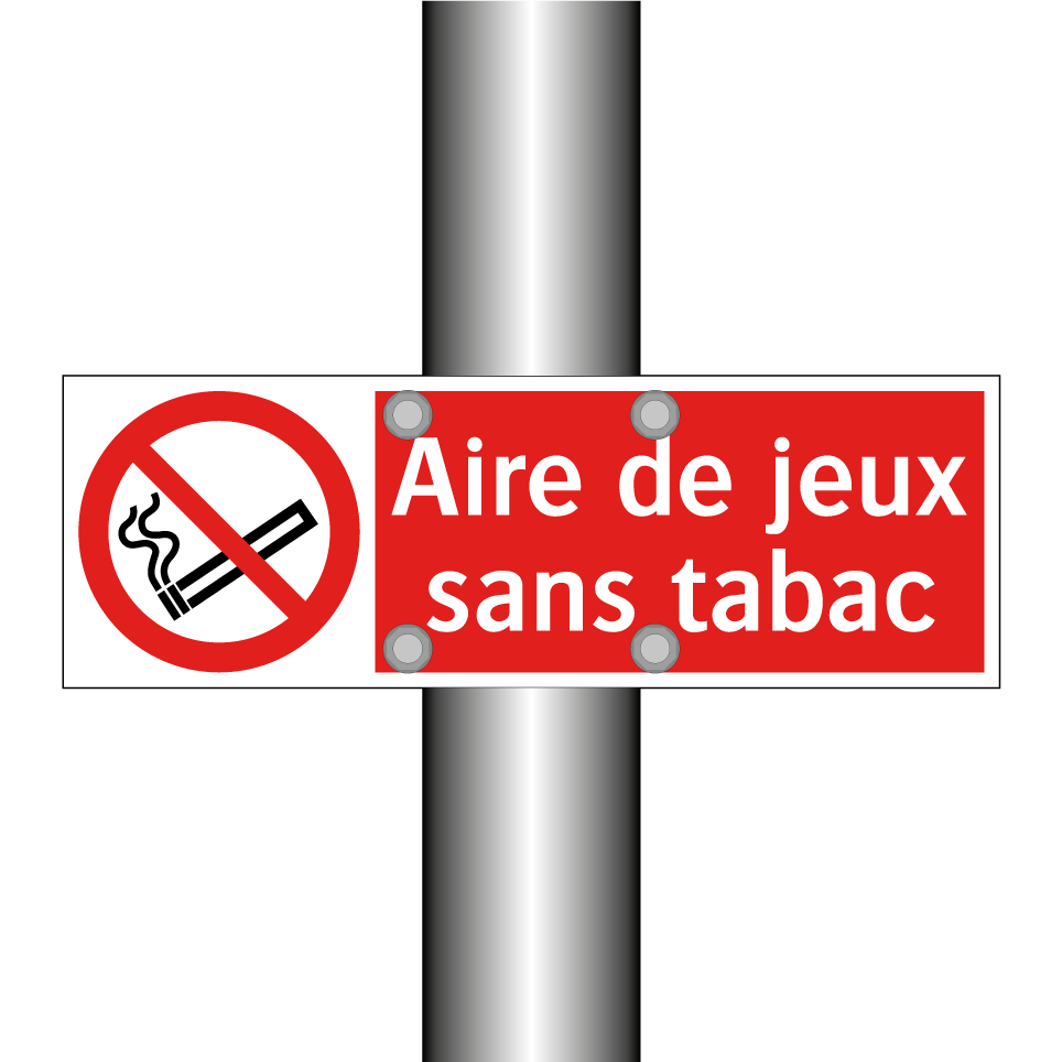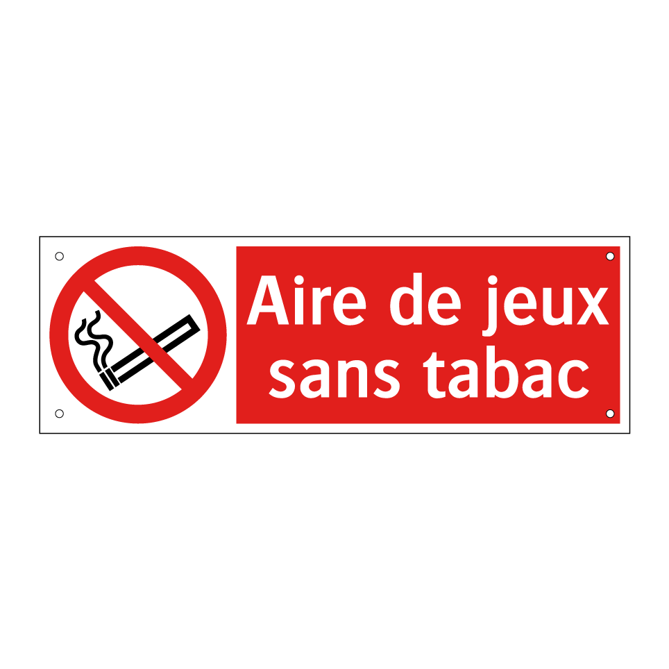 Panneau d'interdiction avec le texte : "Aire de jeux sans tabac" et une symbolique claire.