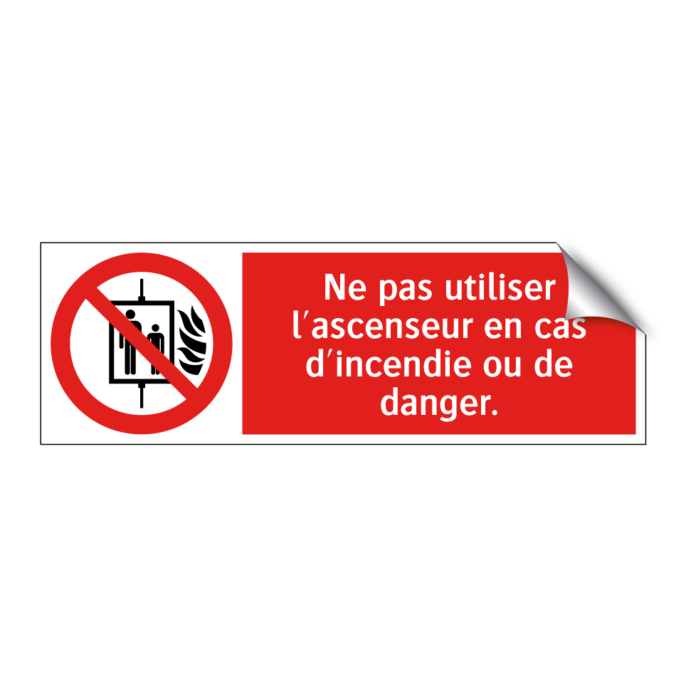 Panneau d'interdiction avec le texte : "Ne pas utiliser l'ascenseur en cas d'incendie ou de danger." et une symbolique claire.