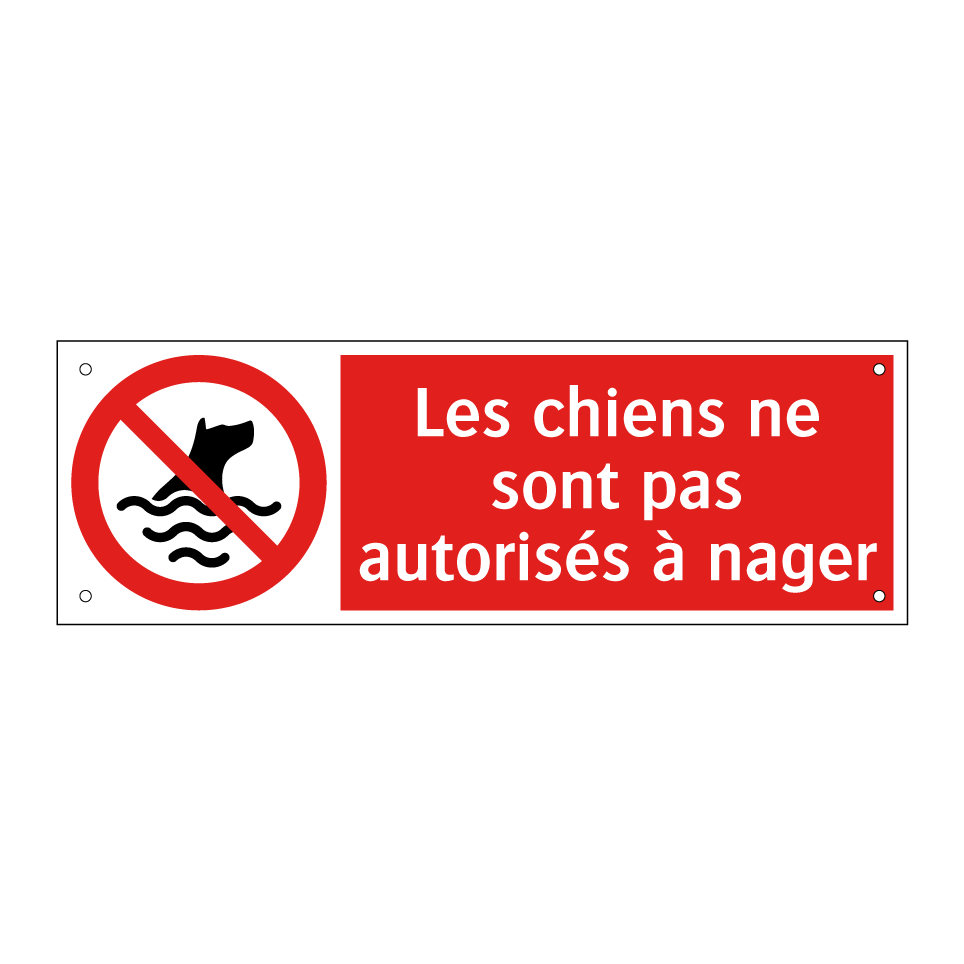 Panneau d'interdiction avec le texte : "Les chiens ne sont pas autorisés à nager" et une symbolique claire.