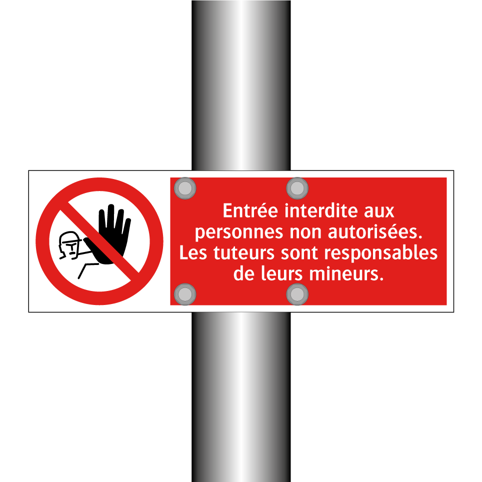 Panneau d'interdiction avec le texte : "Entrée interdite aux personnes non autorisées. Les tuteurs sont responsables de leurs mineurs." et une symbolique claire.