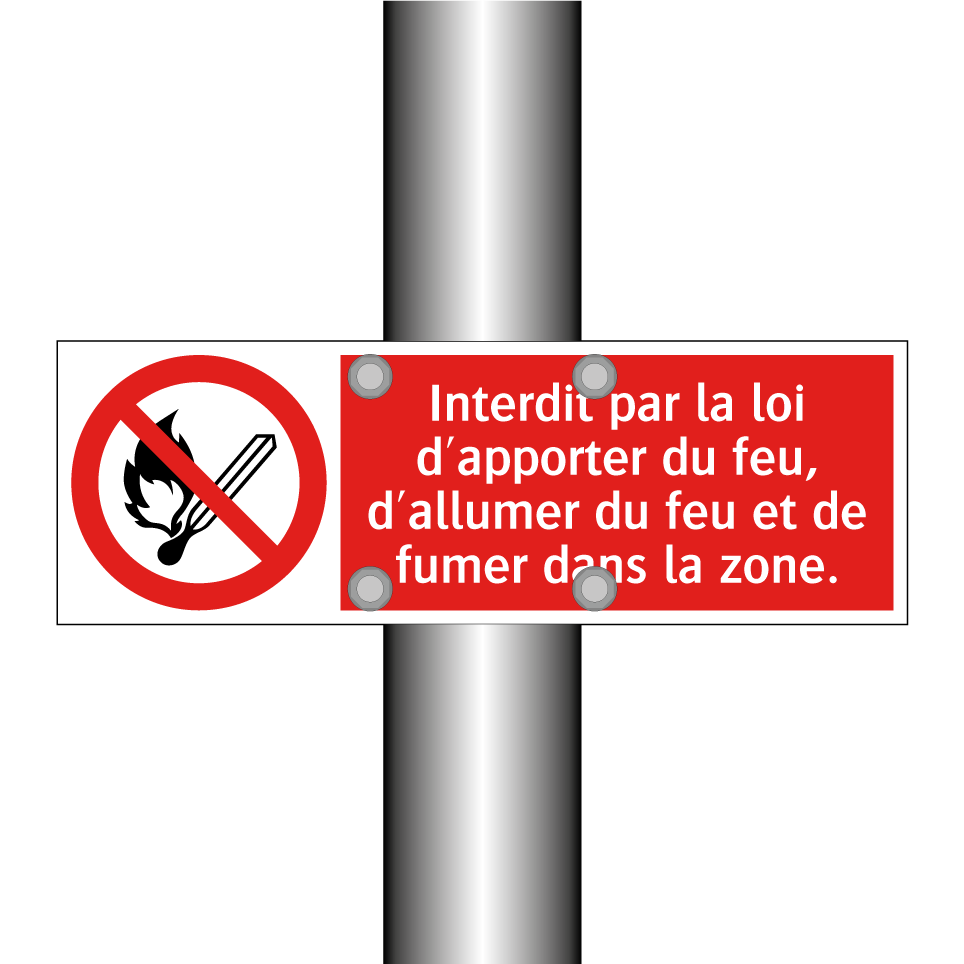 Panneau d'interdiction avec le texte : "Interdit par la loi d'apporter du feu, d'allumer du feu et de fumer dans la zone." et une symbolique claire.