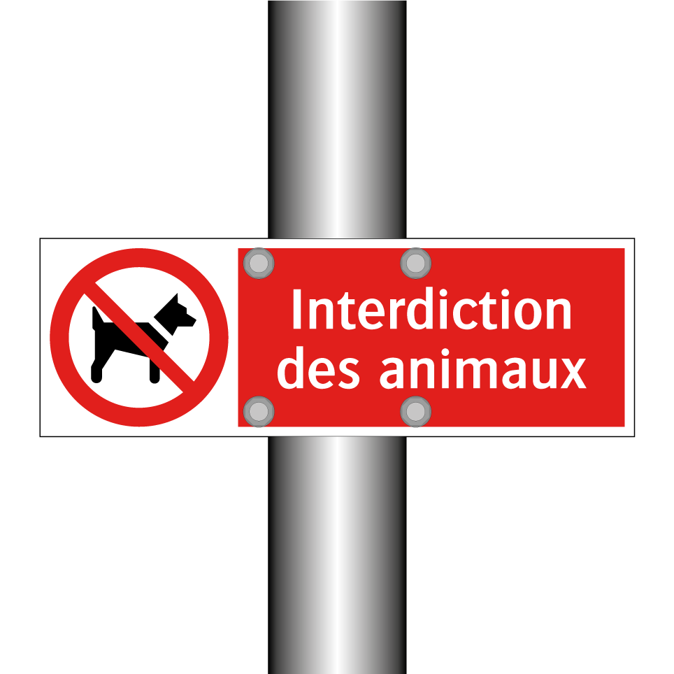 Panneau d'interdiction avec le texte : "Interdiction des animaux" et une symbolique claire.