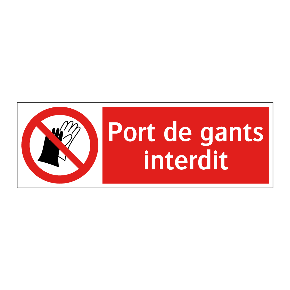 Panneau d'interdiction avec le texte : "Port de gants interdit" et une symbolique claire.