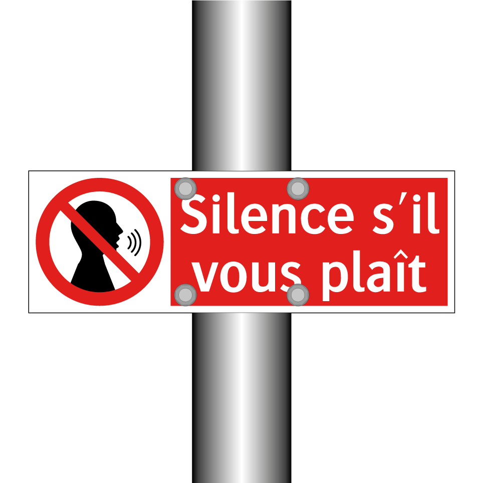 Panneau d'interdiction avec le texte : "Silence s'il vous plaît" et une symbolique claire.