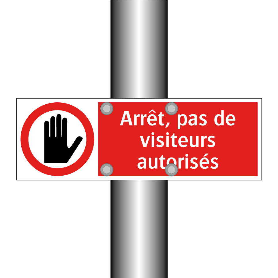 Panneau d'interdiction avec le texte : "Arrêt, pas de visiteurs autorisés" et une symbolique claire.