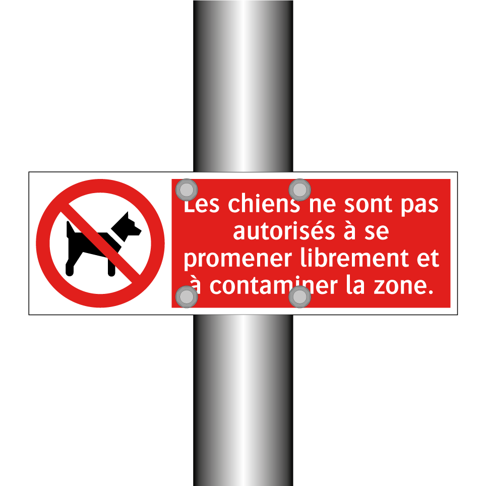 Panneau d'interdiction avec le texte : "Les chiens ne sont pas autorisés à se promener librement et à contaminer la zone." et une symbolique claire.
