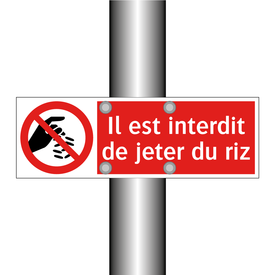 Panneau d'interdiction avec le texte : "Il est interdit de jeter du riz" et une symbolique claire.