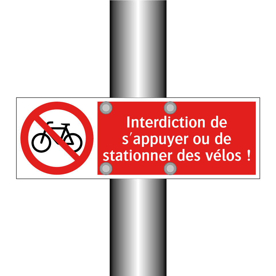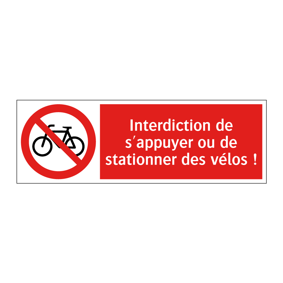 Panneau d'interdiction avec le texte : "Interdiction de s'appuyer ou de stationner des vélos !" et une symbolique claire.