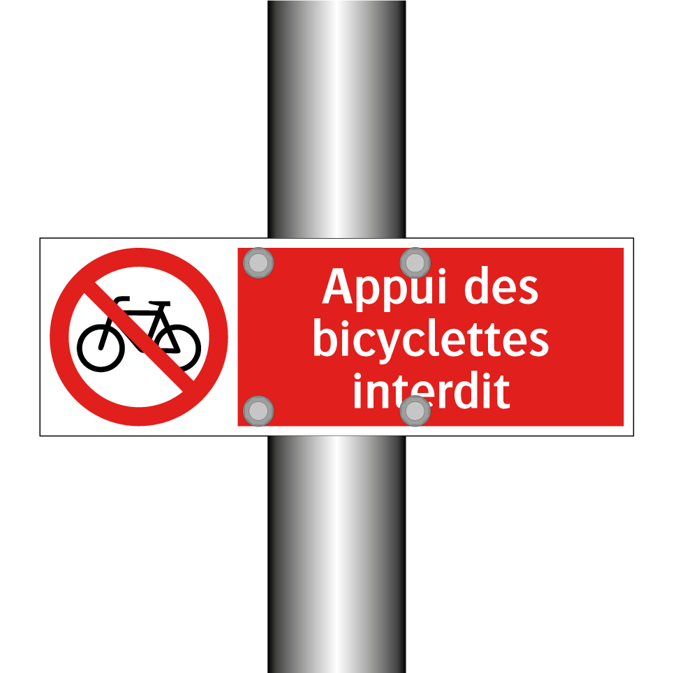 Panneau d'interdiction avec le texte : "Appui des bicyclettes interdit" et une symbolique claire.