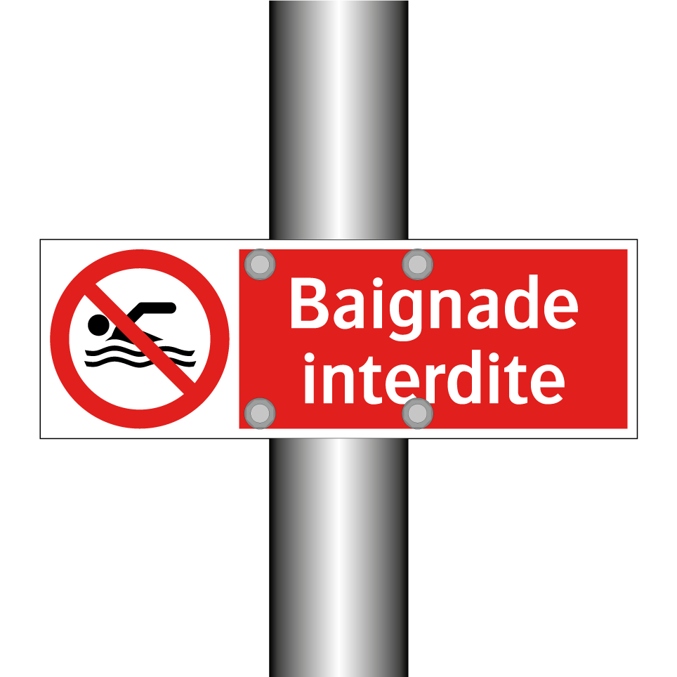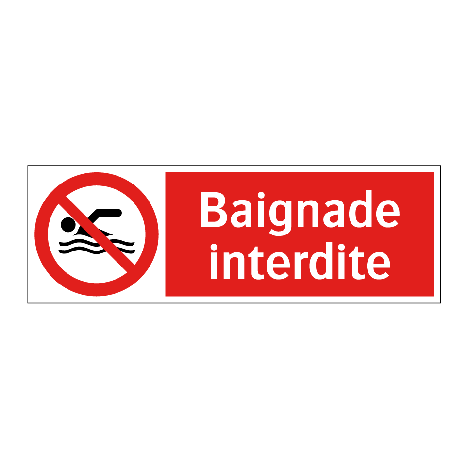 Panneau d'interdiction avec le texte : "Baignade interdite" et une symbolique claire.
