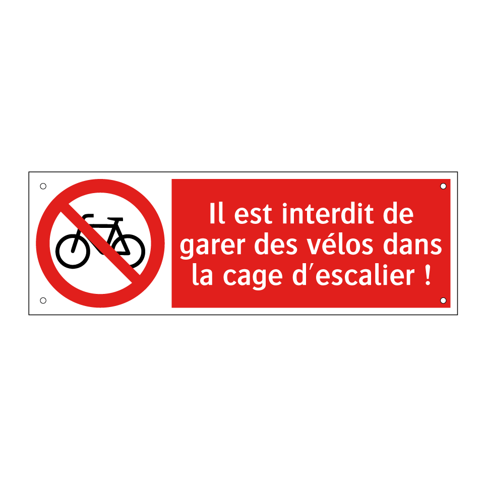 Panneau d'interdiction avec le texte : "Il est interdit de garer des vélos dans la cage d'escalier !" et une symbolique claire.