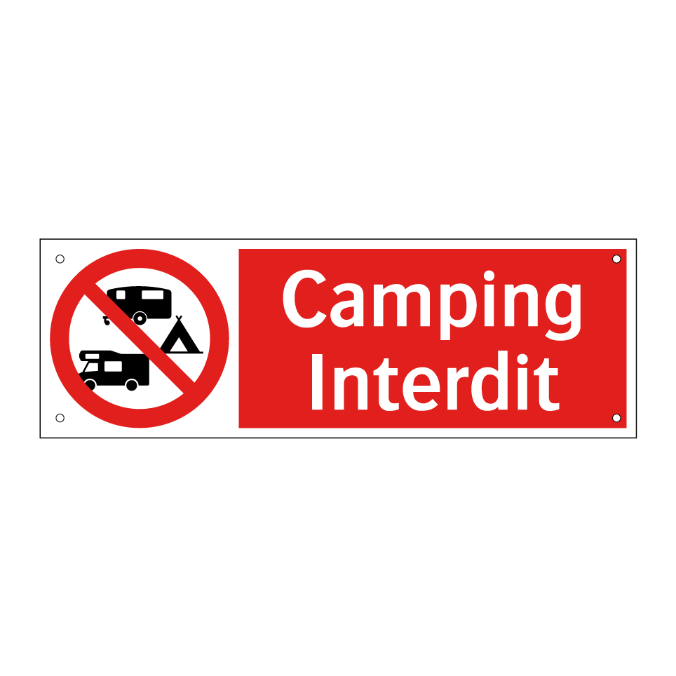 Panneau d'interdiction avec le texte : "Camping Interdit" et une symbolique claire.