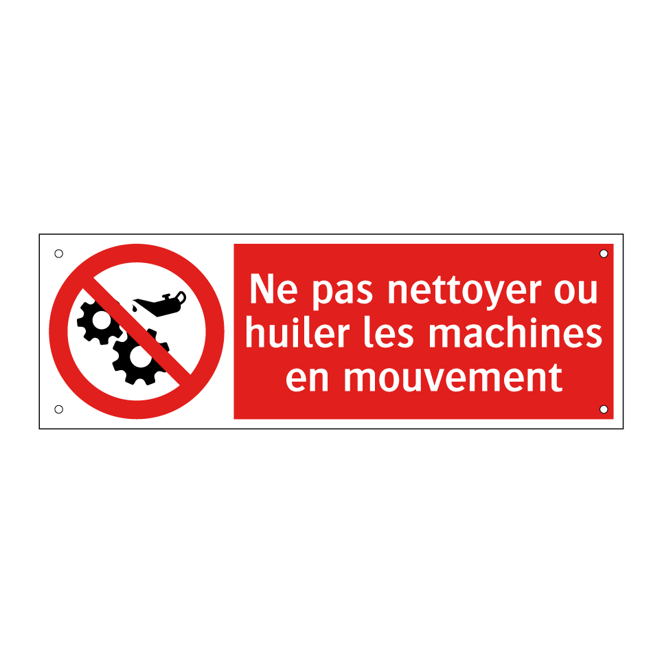 Panneau d'interdiction avec le texte : "Ne pas nettoyer ou huiler les machines en mouvement" et une symbolique claire.