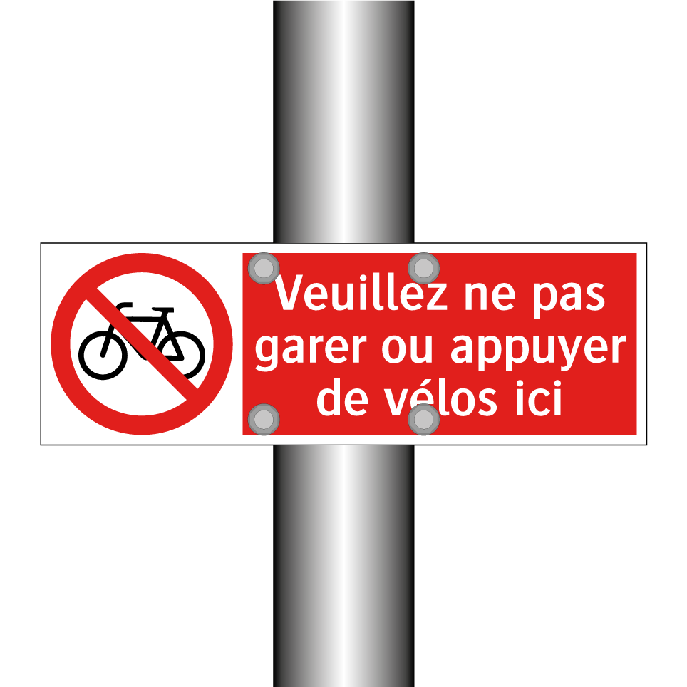 Panneau d'interdiction avec le texte : "Veuillez ne pas garer ou appuyer de vélos ici" et une symbolique claire.