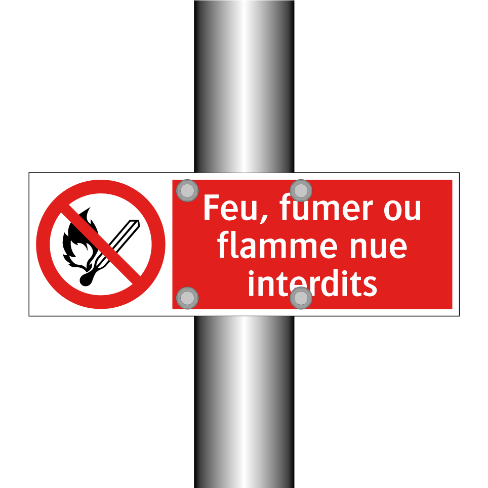 Panneau d'interdiction avec le texte : "Feu, fumer ou flamme nue interdits" et une symbolique claire.