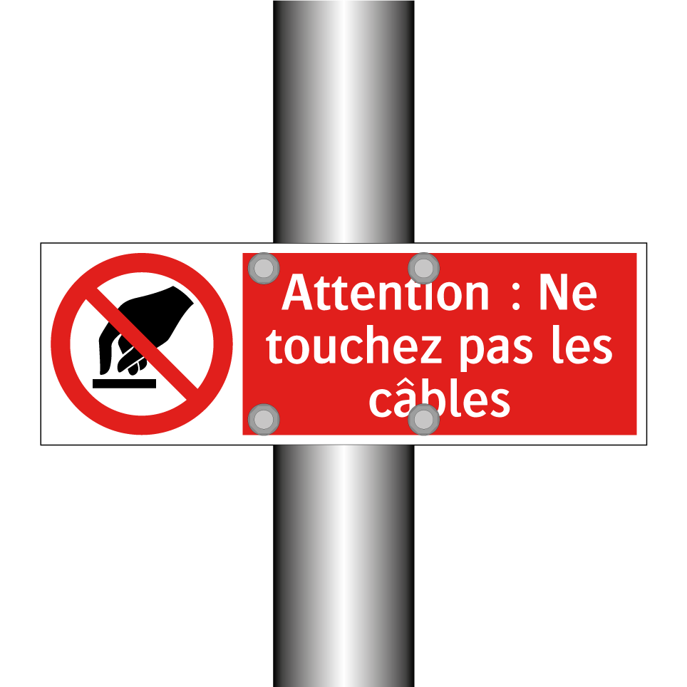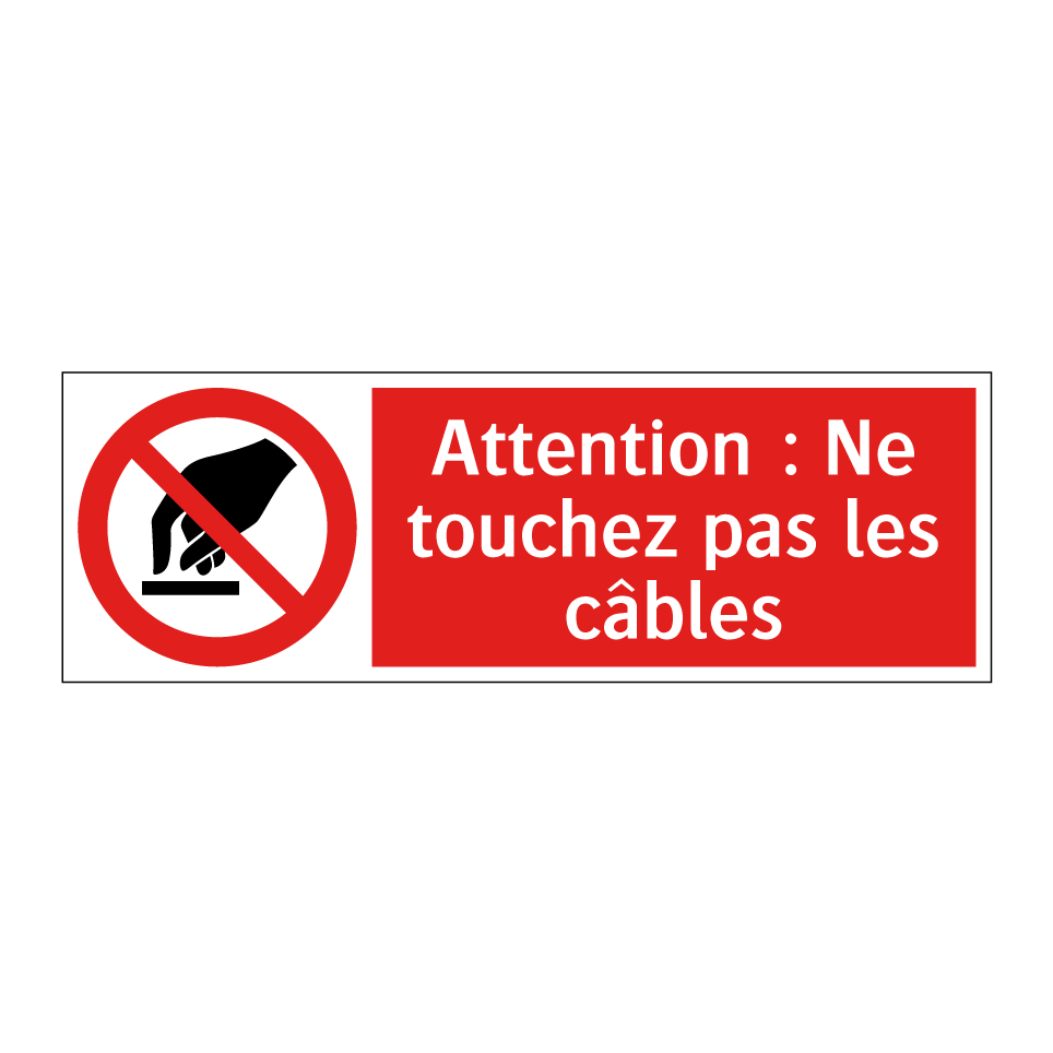 Panneau d'interdiction avec le texte : "Attention : Ne touchez pas les câbles" et une symbolique claire.