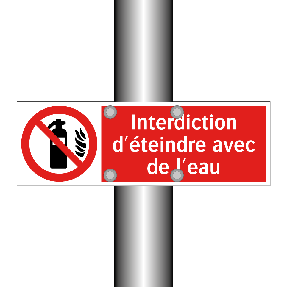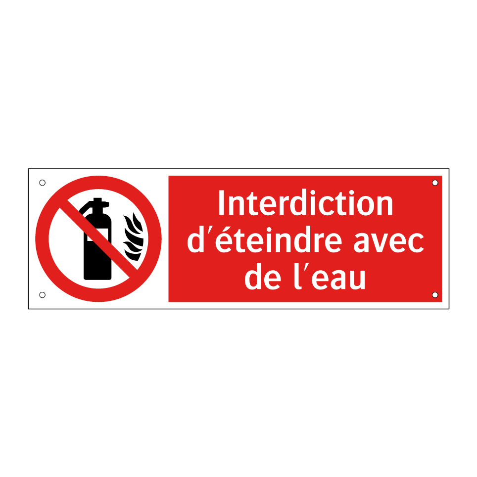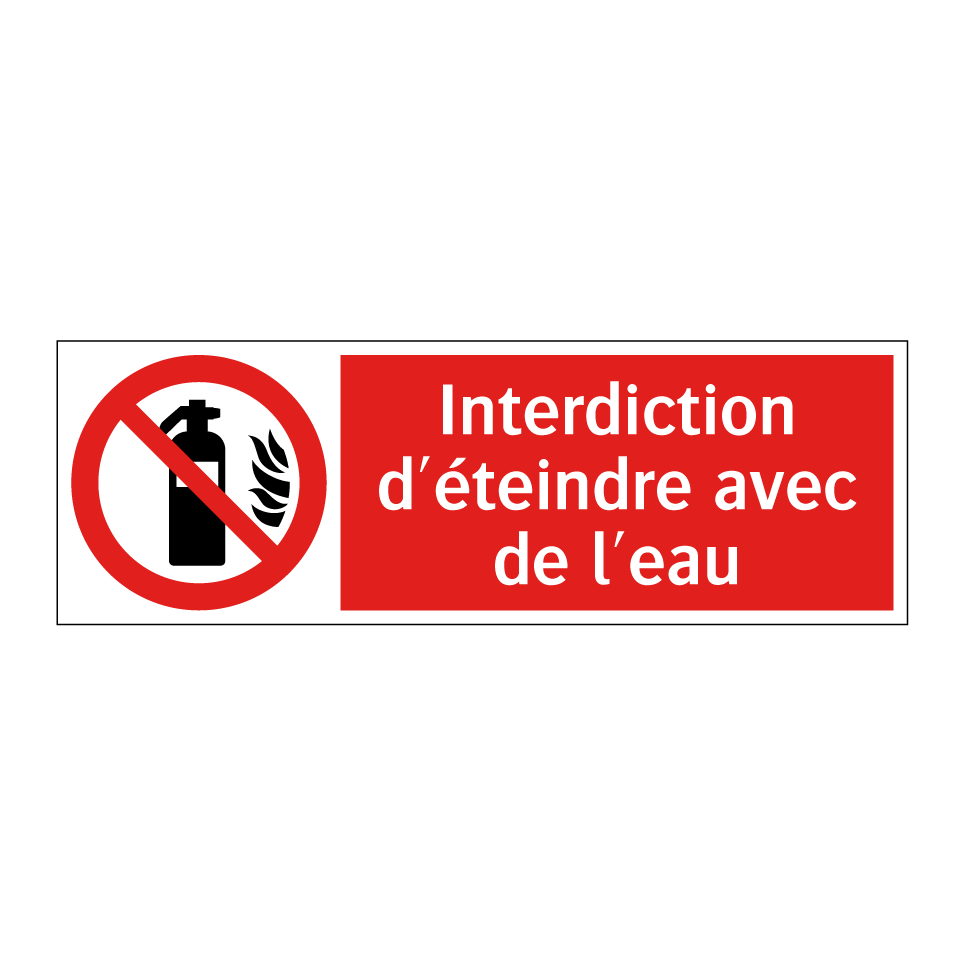 Panneau d'interdiction avec le texte : "Interdiction d'éteindre avec de l'eau" et une symbolique claire.