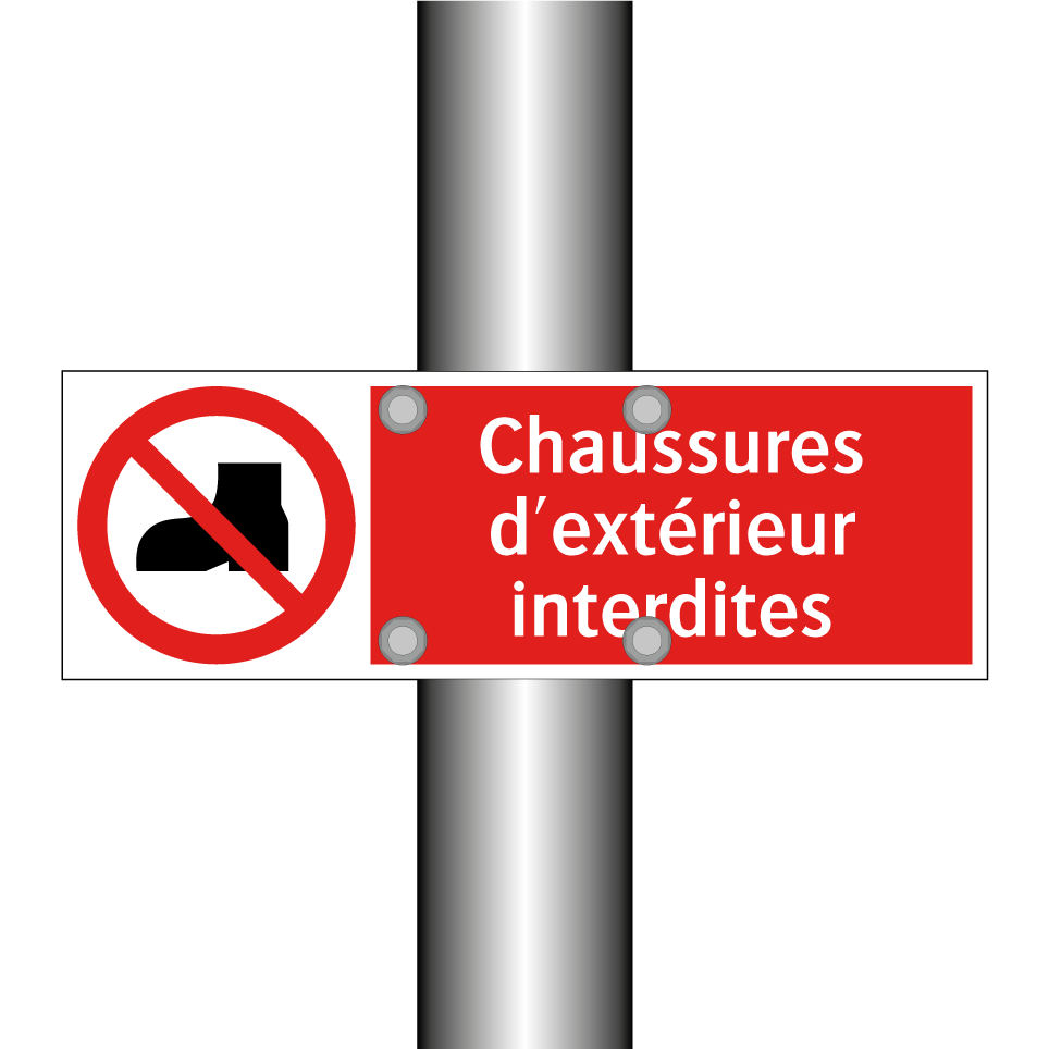 Panneau d'interdiction avec le texte : "Chaussures d'extérieur interdites" et une symbolique claire.