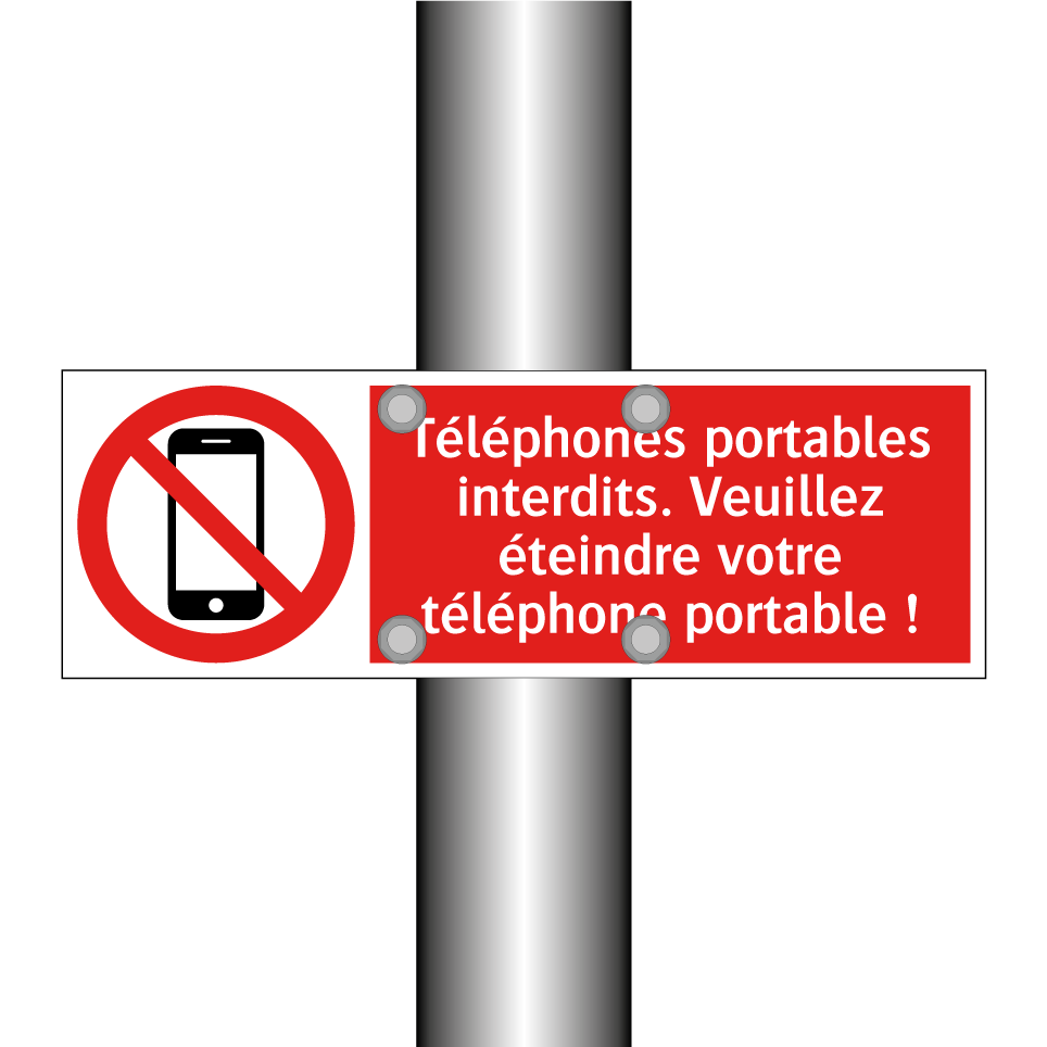 Panneau d'interdiction avec le texte : "Téléphones portables interdits. Veuillez éteindre votre téléphone portable !" et une symbolique claire.
