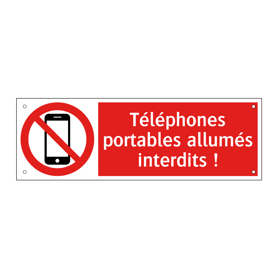 Panneau d'interdiction avec le texte : "Téléphones portables allumés interdits !" et une symbolique claire.