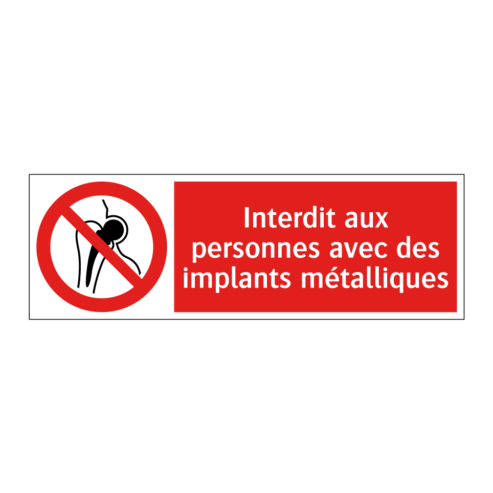Panneau d'interdiction avec le texte : "Interdit aux personnes avec des implants métalliques" et une symbolique claire.