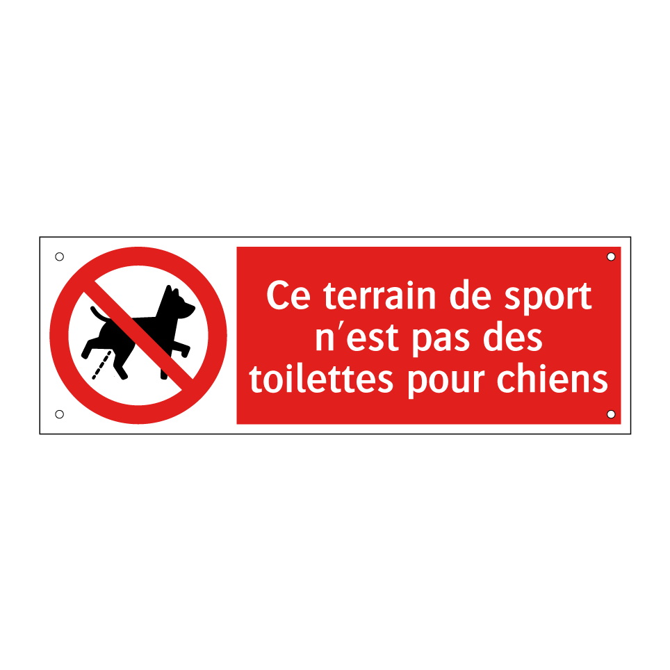 Panneau d'interdiction avec le texte : "Ce terrain de sport n'est pas des toilettes pour chiens" et une symbolique claire.