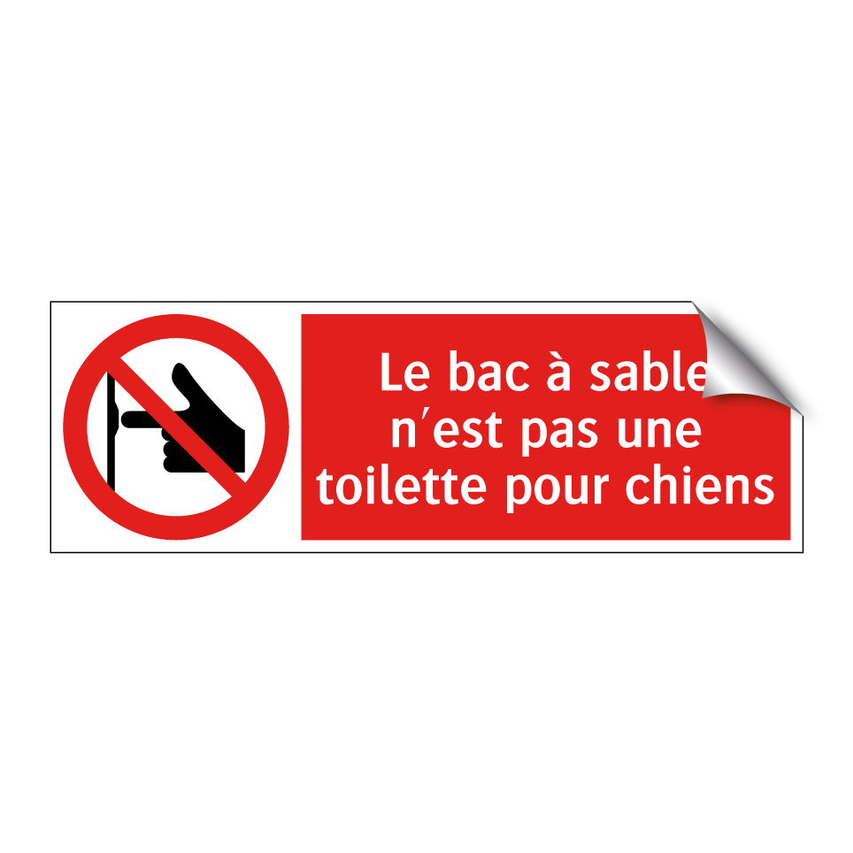 Panneau d'interdiction avec le texte : "Le bac à sable n'est pas une toilette pour chiens" et une symbolique claire.