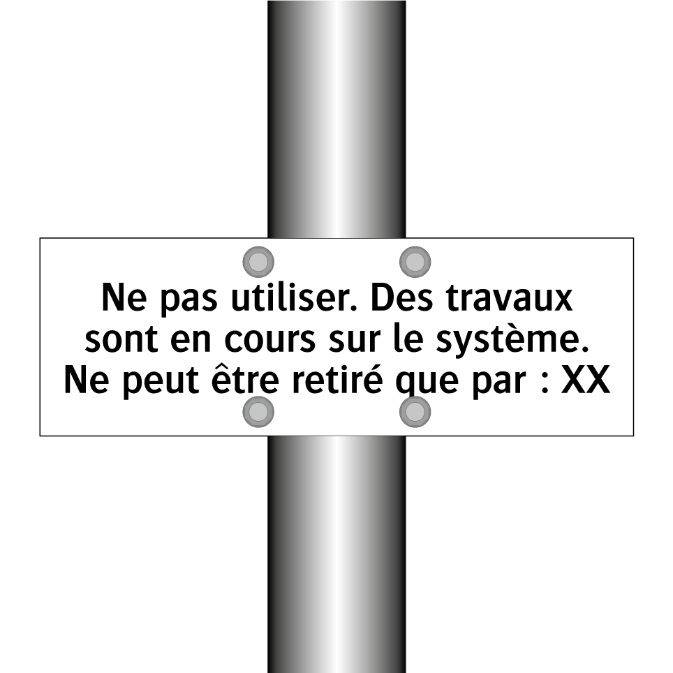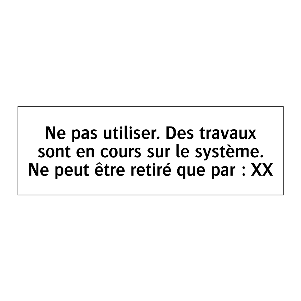Panneau d'interdiction avec le texte : "Ne pas utiliser. Des travaux sont en cours sur le système. Ne peut être retiré que par : XX"